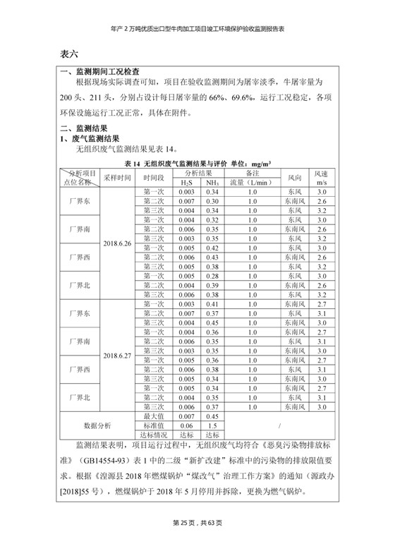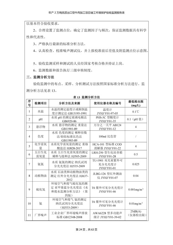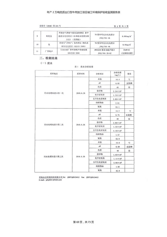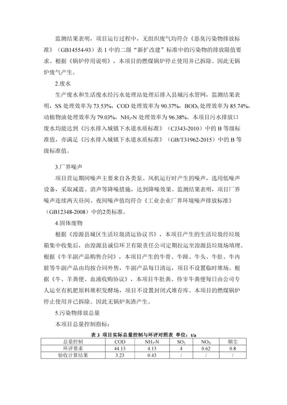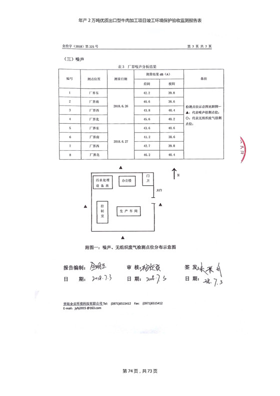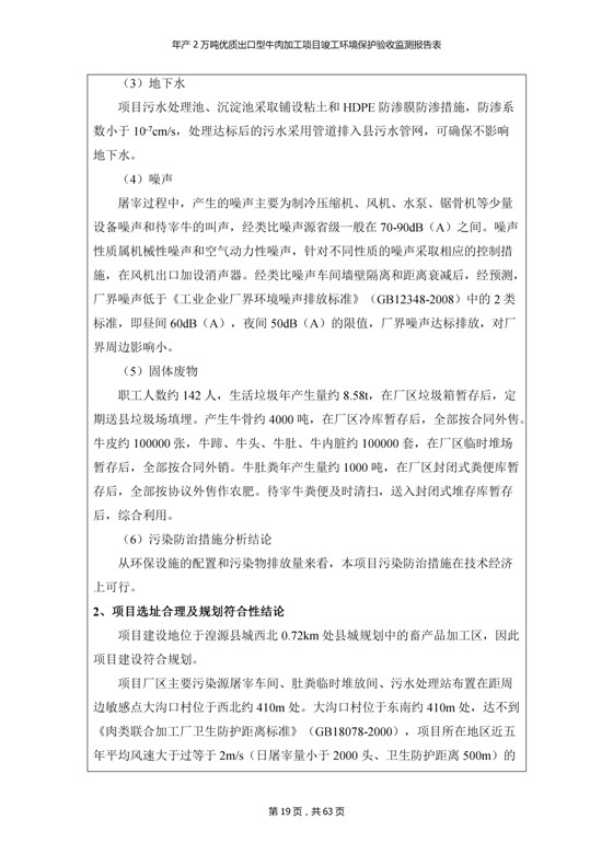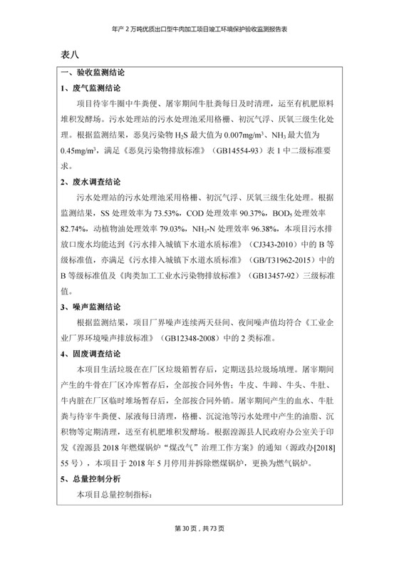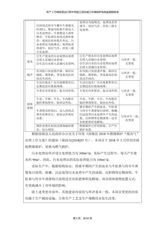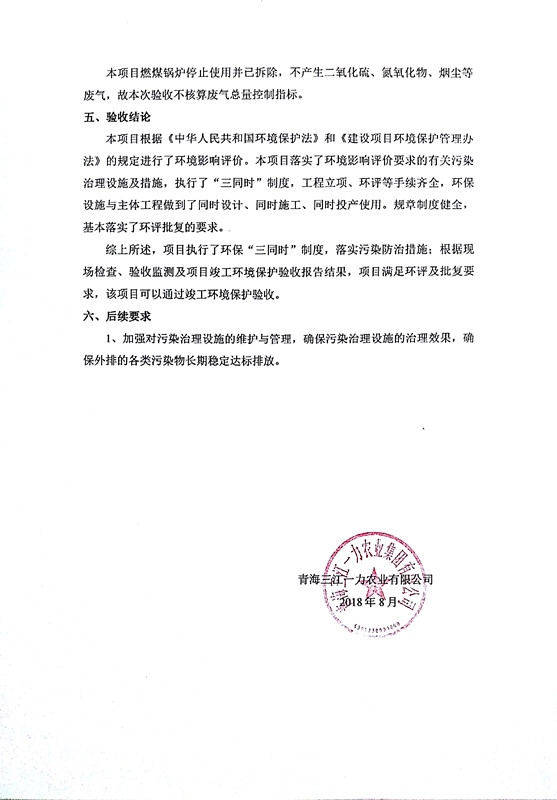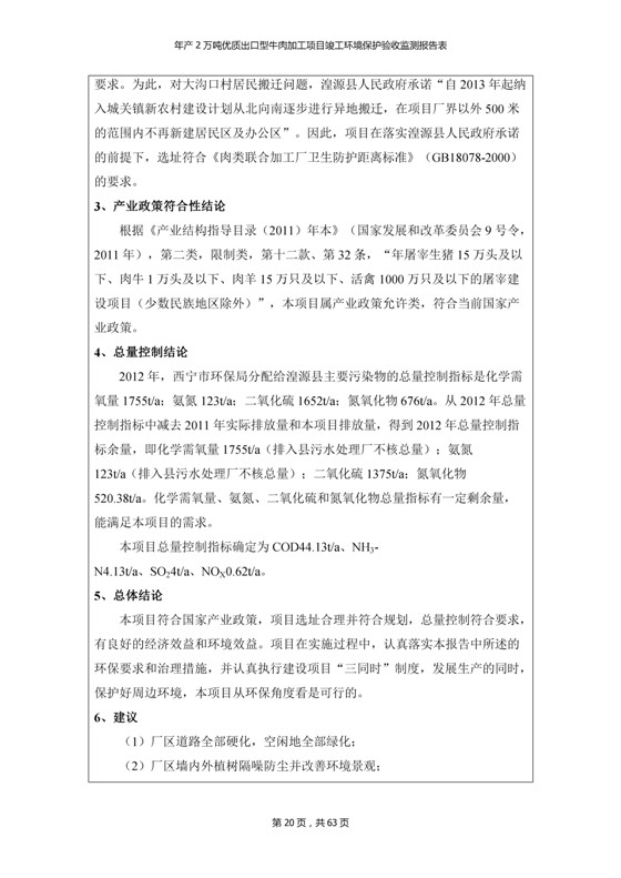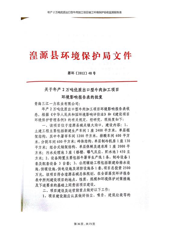 根據(jù)中華人民共和國(guó)國(guó)務(wù)院令第253號(hào)《建設(shè)項(xiàng)目環(huán)境保護(hù)管理?xiàng)l例》(中華人民共和國(guó)國(guó)務(wù)院令第682號(hào)《國(guó)務(wù)院關(guān)于修改〈建設(shè)項(xiàng)目環(huán)境保護(hù)管理?xiàng)l例〉的決定》和《建設(shè)項(xiàng)目竣工環(huán)境保護(hù)驗(yàn)收暫行辦法》,嚴(yán)格依照有關(guān)法律法規(guī),建設(shè)項(xiàng)目環(huán)境保護(hù)設(shè)施驗(yàn)收技術(shù)規(guī)范,本項(xiàng)目環(huán)評(píng)報(bào)告表和環(huán)保審批部門審批意見以及企業(yè)自行驗(yàn)收相關(guān)要求等對(duì)本項(xiàng)目進(jìn)行驗(yàn)收,本項(xiàng)目符合環(huán)保驗(yàn)收條件,可以通過(guò)環(huán)保驗(yàn)收。 青海三江一力農(nóng)業(yè)有限公司組織召開年產(chǎn)2萬(wàn)噸優(yōu)質(zhì)出口型牛肉加工項(xiàng)目(一期工程)驗(yàn)收組意見.