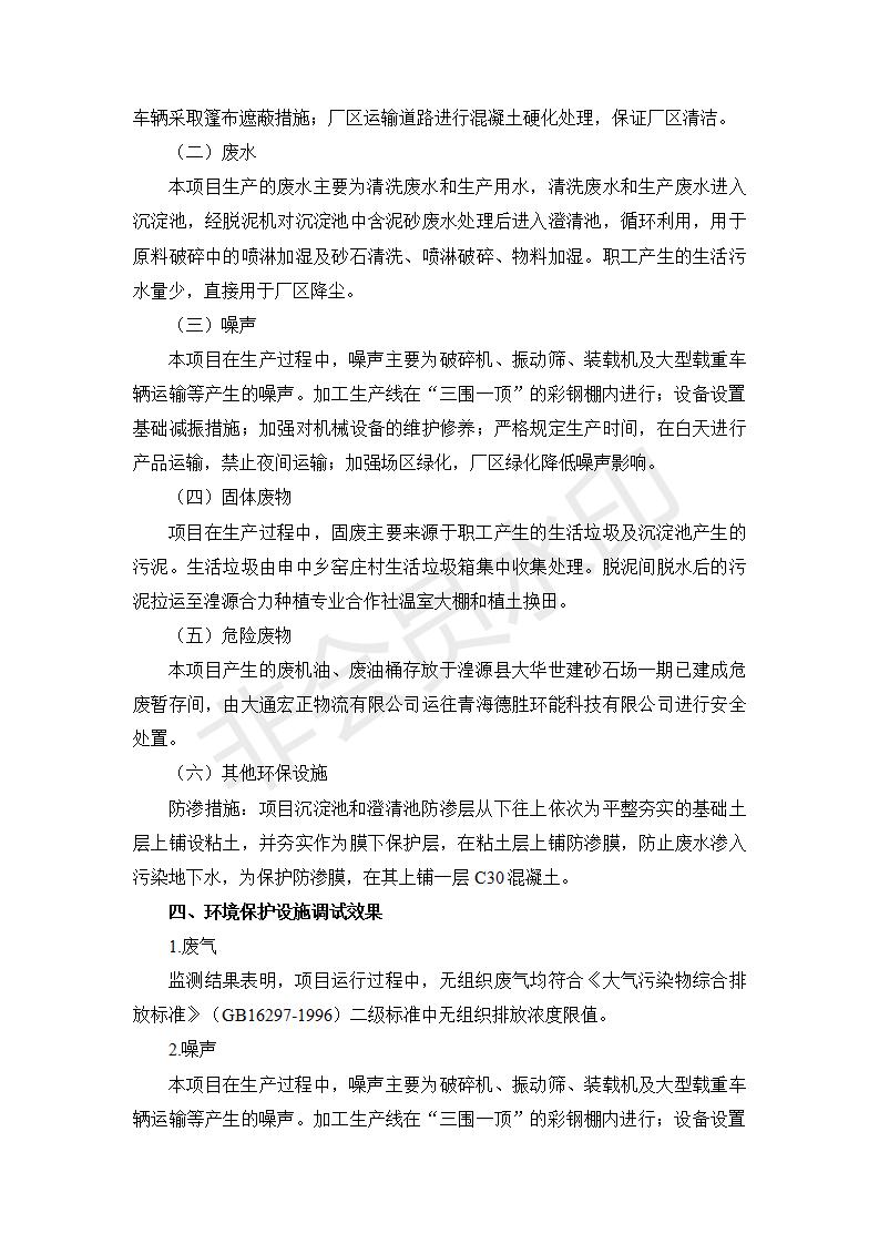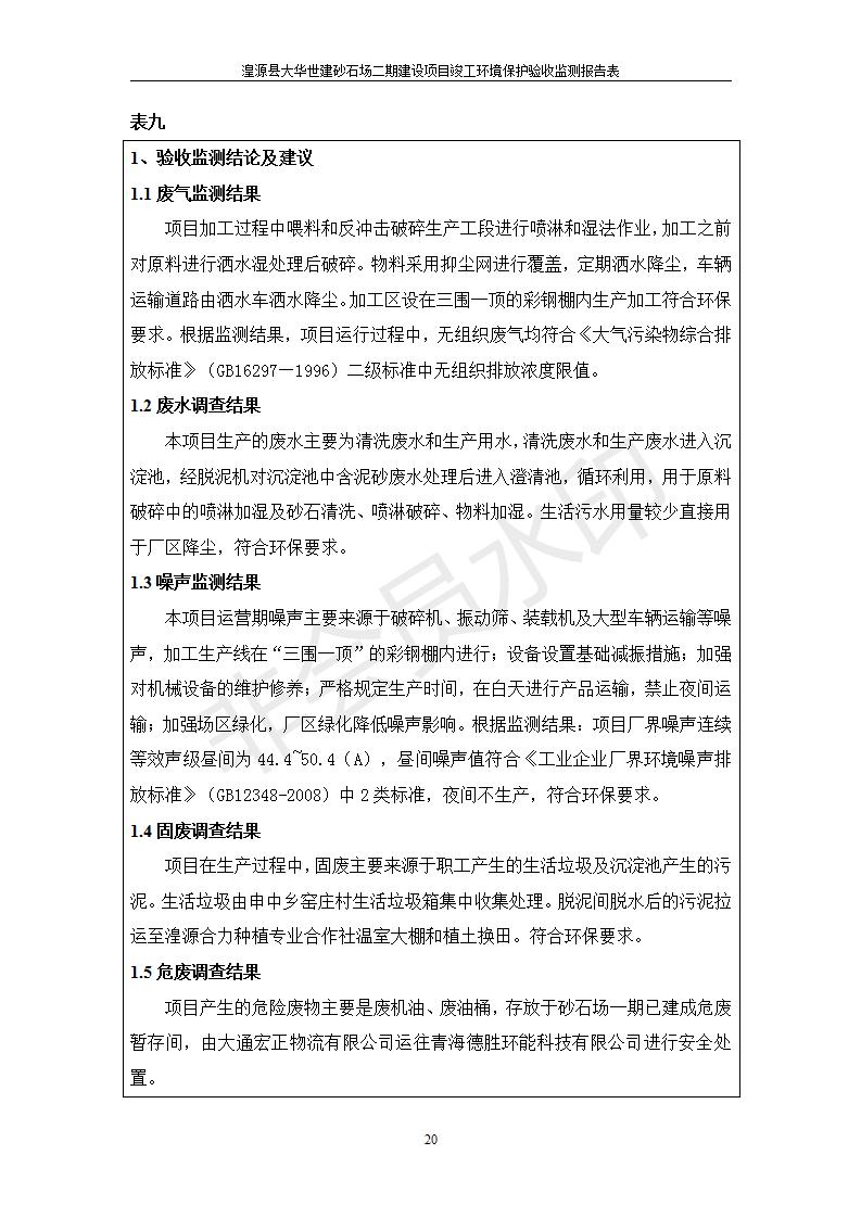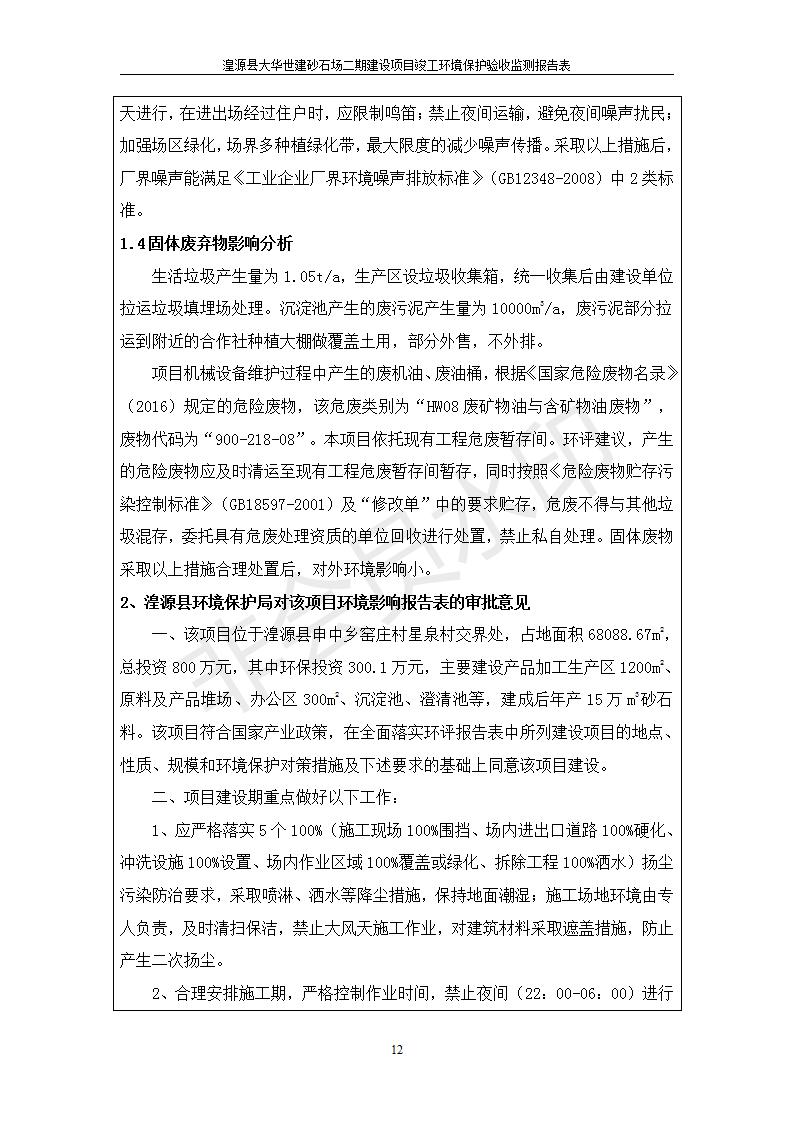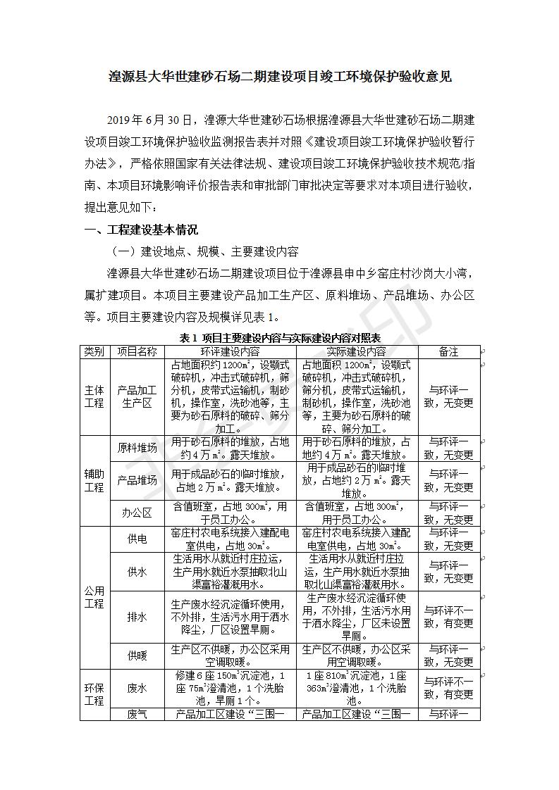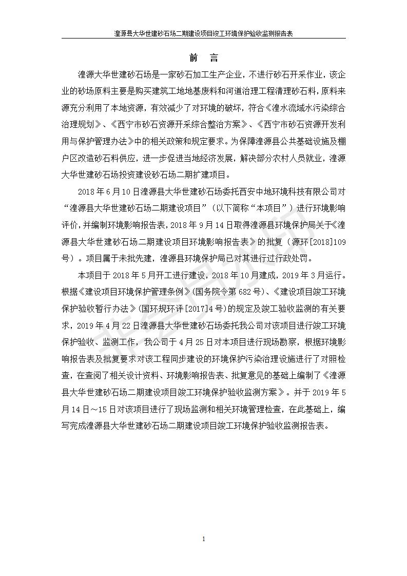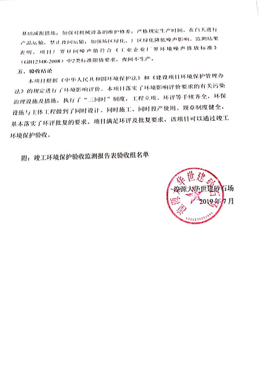 根據(jù)中華人民共和國(guó)國(guó)務(wù)院令第682號(hào)《國(guó)務(wù)院關(guān)于修改〈建設(shè)項(xiàng)目環(huán)境保護(hù)管理?xiàng)l例〉的決定》和《建設(shè)項(xiàng)目竣工環(huán)境保護(hù)驗(yàn)收暫行辦法》(國(guó)務(wù)院令682號(hào)),湟源大華世建砂石場(chǎng)湟源縣大華世建砂石場(chǎng)二期建設(shè)項(xiàng)目(包括竣工環(huán)境保護(hù)驗(yàn)收監(jiān)測(cè)報(bào)告表和驗(yàn)收意見)公示如下。 一、項(xiàng)目名稱:湟源縣大華世建砂石場(chǎng)二期建設(shè)項(xiàng)目 二、地點(diǎn):湟源縣申中鄉(xiāng)窯莊村沙崗大小灣 三、建設(shè)單位:湟源大華世建砂石場(chǎng) 四、建設(shè)內(nèi)容:項(xiàng)目主要建設(shè)砂石料產(chǎn)品加工生產(chǎn)區(qū)、原料堆場(chǎng)、產(chǎn)品堆場(chǎng)、辦公區(qū)等。五、聯(lián)系人:張工 六、聯(lián)系電 話:0971-6515411 七、公示時(shí)間:二〇一九年七月二十五日至二〇一九年八月二十一日公示期間,對(duì)上述公示內(nèi)容如有異議,請(qǐng)以書面形式反饋,個(gè)人須署真實(shí)姓名,單位須加蓋公章。