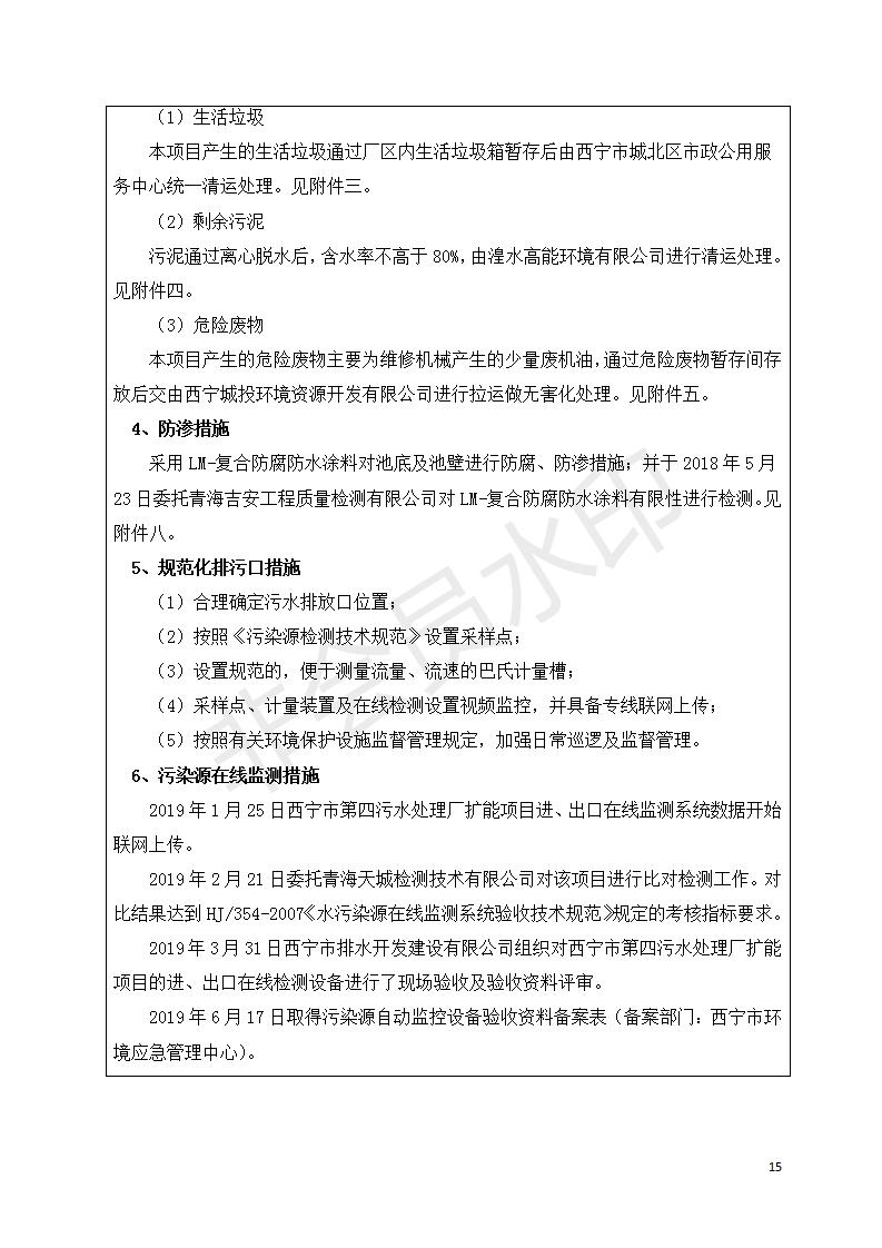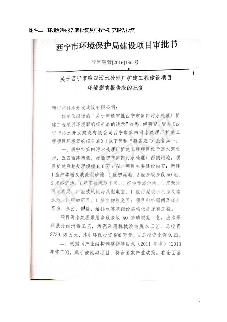 根據(jù)中華人民共和國(guó)國(guó)務(wù)院令第682號(hào)《國(guó)務(wù)院關(guān)于修改〈建設(shè)項(xiàng)目環(huán)境保護(hù)管理?xiàng)l例〉的決定》和《建設(shè)項(xiàng)目竣工環(huán)境保護(hù)驗(yàn)收暫行辦法》(國(guó)務(wù)院令682號(hào)),西寧市第四污水處理廠擴(kuò)建工程建設(shè)項(xiàng)目(包括竣工環(huán)境保護(hù)驗(yàn)收監(jiān)測(cè)報(bào)告表和驗(yàn)收意見)公示如下。 一、項(xiàng)目名稱:西寧市第四污水處理廠擴(kuò)建工程建設(shè)項(xiàng)目 二、地點(diǎn):五四西路南側(cè),原西寧市第四污水處理廠西側(cè)用地 三、建設(shè)單位:西寧市排水開發(fā)建設(shè)有限公司 四、建設(shè)內(nèi)容:第四污水處理廠擴(kuò)建工程五、聯(lián)系人:張工 六、聯(lián)系電 話:0971-6515411 七、公示時(shí)間:二〇一九年九月十七日至二〇一九年十月十八日公示期間,對(duì)上述公示內(nèi)容如有異議,請(qǐng)以書面形式反饋,個(gè)人須署真實(shí)姓名,單位須加蓋公章。