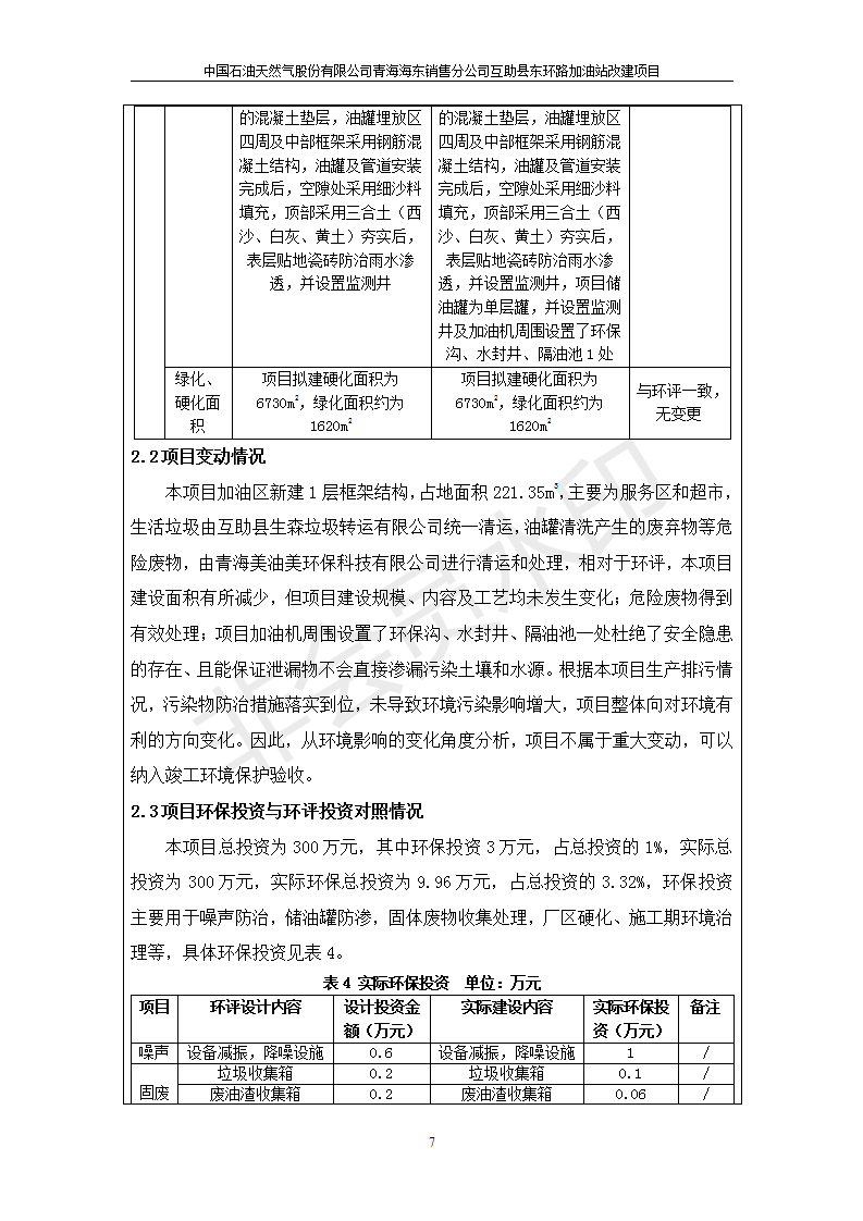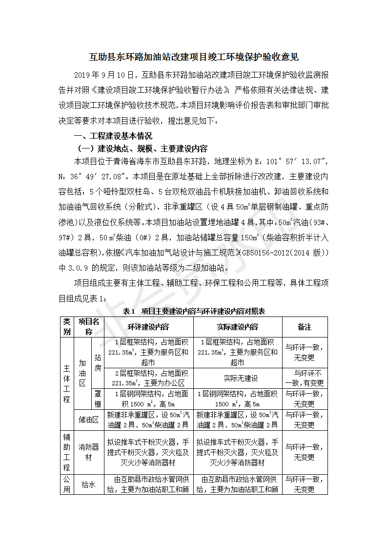 根據(jù)中華人民共和國國務院令第682號《國務院關于修改〈建設項目環(huán)境保護管理條例〉的決定》和《建設項目竣工環(huán)境保護驗收暫行辦法》(國務院令682號),互助縣東環(huán)路加油站改建項目(包括竣工環(huán)境保護驗收監(jiān)測報告表和驗收意見)公示如下。 一、項目名稱:互助縣東環(huán)路加油站改建項目 二、地點:青海省海東市互助縣東環(huán)路 六、聯(lián)系電話:0971-6515411 七、公示時間:二〇一九年九月二十七日至二〇一九年十月二十九日 公示期間,對上述公示內(nèi)容如有異議,請以書面形式反饋,個人須署真實姓名,單位須加蓋公章。