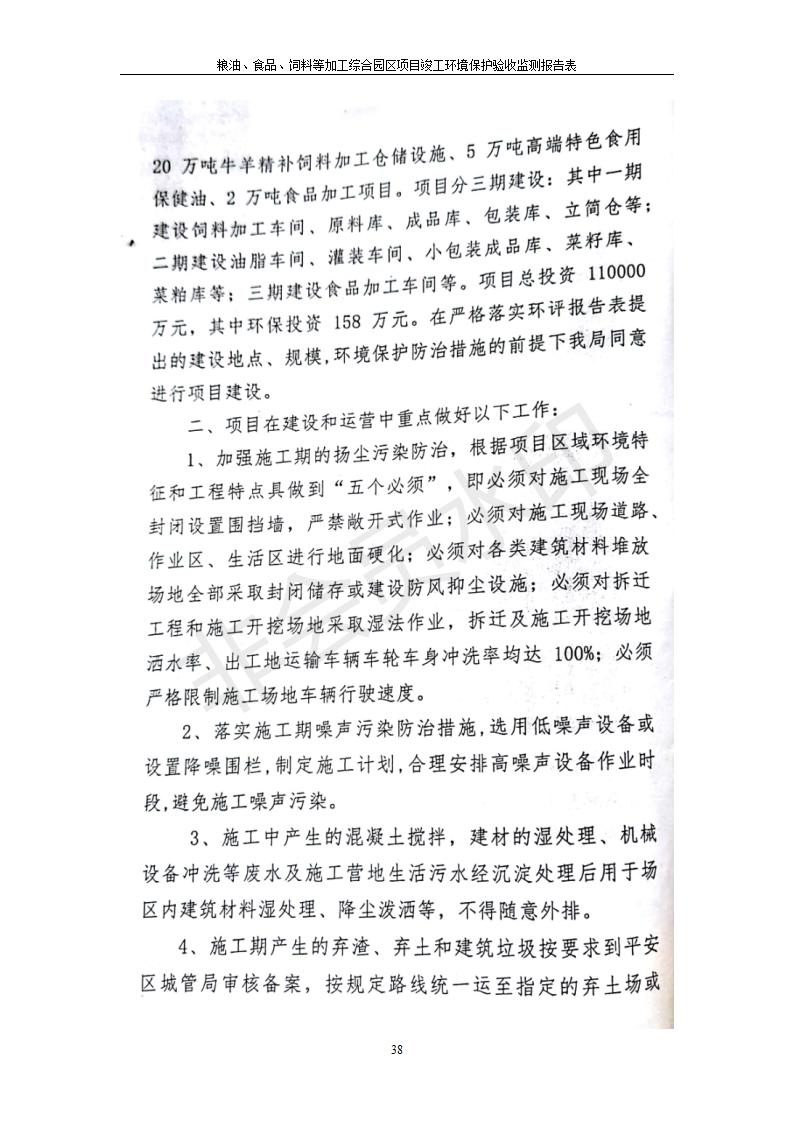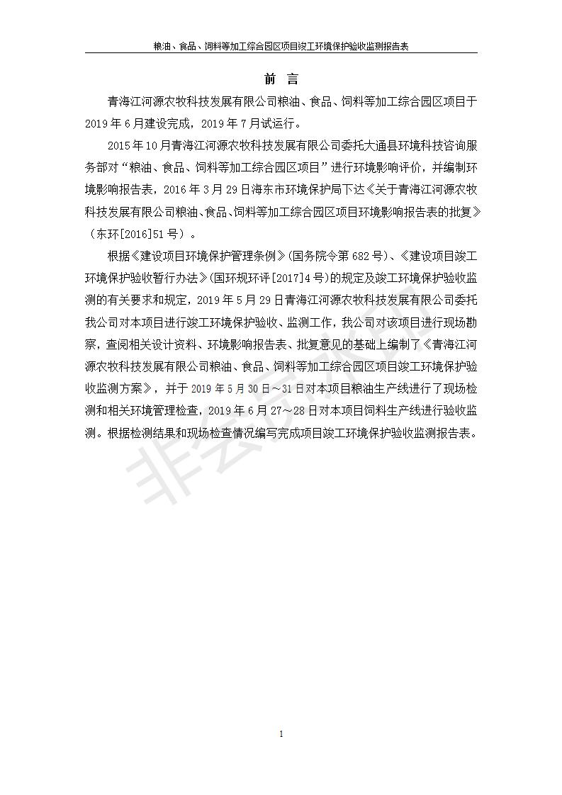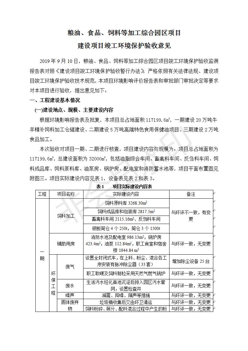 根據(jù)中華人民共和國國務(wù)院令第682號《國務(wù)院關(guān)于修改〈建設(shè)項目環(huán)境保護管理條例〉的決定》和《建設(shè)項目竣工環(huán)境保護驗收暫行辦法》(國務(wù)院令682號),糧油、食品、飼料等加工綜合園區(qū)項目竣工環(huán)境保護驗收監(jiān)測報告表(包括竣工環(huán)境保護驗收監(jiān)測報告表和驗收意見)公示如下。 一、項目名稱:糧油、食品、飼料等加工綜合園區(qū)項目 二、地點:河湟新區(qū)(海東工業(yè)園區(qū)臨空綜合經(jīng)濟園) 六、聯(lián)系電話:0971-6515411 七、公示時間:二〇一九年十月九日至二〇一九年十一月五日 公示期間,對上述公示內(nèi)容如有異議,請以書面形式反饋,個人須署真實姓名,單位須加蓋公章。