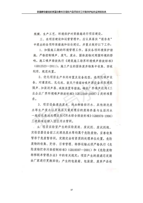 新建酵母重組膠原蛋白敷料及凝膠產(chǎn)品項(xiàng)目竣工環(huán)境保護(hù)驗(yàn)收監(jiān)測報(bào)告表公示發(fā)布日期:(2020-1-13) 點(diǎn)擊次數(shù):3837 |
